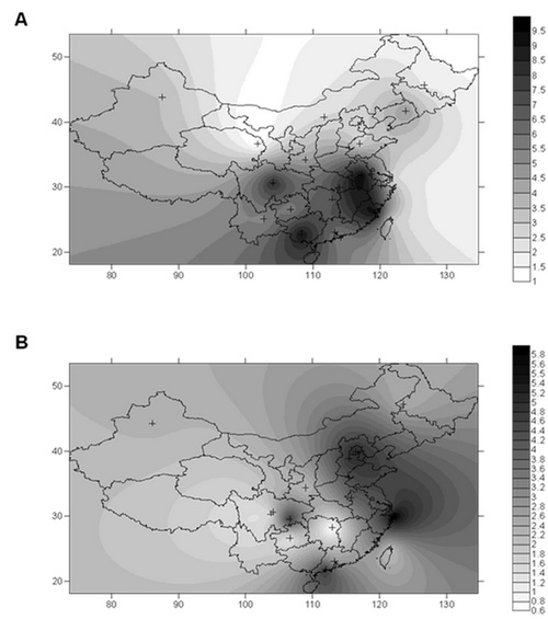 我國mtDNA單倍型類群B5頻率分布(A)與AD流行率(B)有部分重疊效應(yīng)