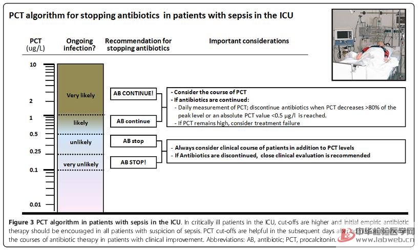 在ICU高風(fēng)險(xiǎn)的患者人群中,開展的不同試驗(yàn)主要是關(guān)于PCT指導(dǎo)終止抗生素的使用。第一個(gè)小樣本的研究發(fā)現(xiàn)[61]:在PCT指導(dǎo)治療下,嚴(yán)重膿毒癥患者的抗生素使用時(shí)間縮短了4天。2010年法國的多中心大樣本研究(PRORATA試驗(yàn))結(jié)果顯示[62],PCT指導(dǎo)組30天死亡率以及復(fù)發(fā)率都與對照組相似,但無抗菌治療的存活天數(shù)顯著增加(14.3比11.6天)。另一個(gè)關(guān)于呼吸機(jī)相關(guān)肺炎(VAP)的ICU多中心研究結(jié)果顯示,PCT指導(dǎo)組患者無抗菌治療的存活天數(shù)更長(13比9.5天)[63]。兩個(gè)德國的研究評價(jià)了在外科ICU術(shù)后可疑細(xì)菌感染患者中PCT指導(dǎo)抗生素應(yīng)用的價(jià)值,結(jié)果顯示PCT指導(dǎo)組與對照組相比有相似的臨床轉(zhuǎn)歸,但顯著減少了抗生素的用量[64、65]。另外,PCT指導(dǎo)組的ICU住院時(shí)間顯著少于對照組(15.5比17.7天),這與第一個(gè)在ICU中進(jìn)行的研究發(fā)現(xiàn)相似[61]。需要強(qiáng)調(diào)的是,在ICU患者中依據(jù)PCT來終止抗菌治療仍有一定局限性,主要由于ICU患者病情較重,完全依賴PCT指導(dǎo)抗菌治療風(fēng)險(xiǎn)較高。今后期待有不同的試驗(yàn)研究來進(jìn)一步評價(jià)ICU患者抗菌治療中使用PCT的優(yōu)缺點(diǎn)。