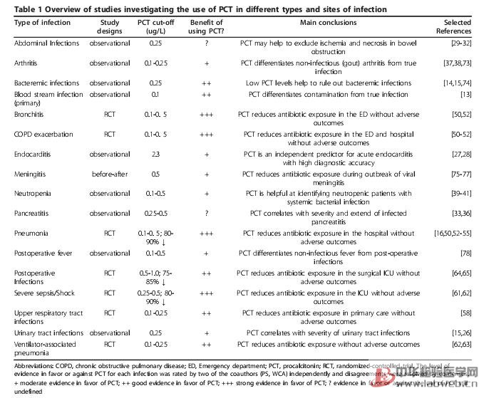 大量的觀察性研究探討了在不同臨床狀況和不同類型、部位感染時(shí)應(yīng)用PCT診斷的可能性。Table 1總結(jié)了針對不同類型感染相關(guān)研究的實(shí)驗(yàn)設(shè)計(jì)、推薦的PCT臨界值以及主要結(jié)論,選擇的重點(diǎn)更多是近期的研究和使用敏感度高的PCT檢測方法(即誤差不超過0.06μg/L范圍)的研究[24,25]。