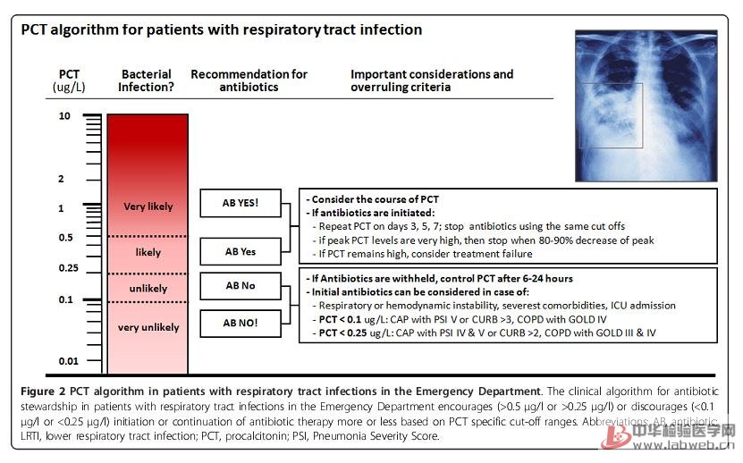 對于上、下呼吸道感染的患者,隨機(jī)對照研究已經(jīng)證實(shí)了PCT指導(dǎo)抗生素應(yīng)用的有效性。對于其他類型的感染,僅有一些觀察性研究的結(jié)果支持PCT的應(yīng)用。目前大多數(shù)干預(yù)性研究的實(shí)施是在瑞士、德國、法國和丹麥等歐洲國家,還有兩項(xiàng)研究在中國,希望進(jìn)一步研究能夠在其它國家批準(zhǔn)實(shí)施。需要強(qiáng)調(diào)的是,對患者PCT水平的評價(jià)必須始終結(jié)合臨床情況和微生物學(xué)檢查結(jié)果。PCT的動(dòng)力學(xué)特性更有利于診斷和預(yù)測預(yù)后,盡可能進(jìn)行重復(fù)檢測,特別是在長期患病決定是否終止抗生素治療時(shí)。每個(gè)PCT檢測方法都具有局限性,包括假陽性和假陰性的結(jié)果[8]。在沒有細(xì)菌感染時(shí),非特異性的PCT水平升高通常見于大量細(xì)胞壞死,如嚴(yán)重創(chuàng)傷或外傷[8,68,69],但通常PCT水平在這些臨床狀況下僅適度升高而后出現(xiàn)迅速的下降。相反,假性PCT低水平則出現(xiàn)在感染早期或局部感染時(shí),而隨后再次復(fù)查時(shí)會發(fā)現(xiàn)PCT水平的升高。因此,臨床需要高敏感度的PCT檢測方法,即使在血中PCT濃度非常低時(shí),微小改變也能夠被檢測到,從而提高實(shí)驗(yàn)的敏感度和患者的安全性。