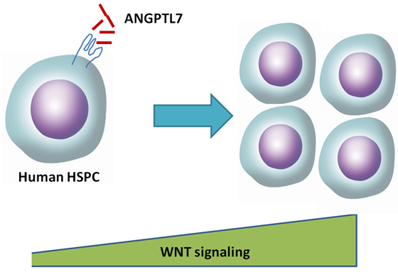 研究中,實驗人員發(fā)現(xiàn)了一種可促進人造血干細胞和祖細胞擴增的鼠胚胎肝臟細胞系,該細胞特異性高表達Angptl7[l1] 蛋白。另外,研究還發(fā)現(xiàn)ANGPLT7蛋白可促進人體造血干細胞和祖細胞在異種移植宿主體內擴增和造血系統(tǒng)重建。rna-seq分析結果顯示,ANGPTL7激活人體造血干細胞和組細胞中CXCR4、HOXB4和WNT下游靶點的表達。另外,通過化學調控WNT信號通路可以弱化ANGTPL7對人體造血干細胞和祖細胞的作用。