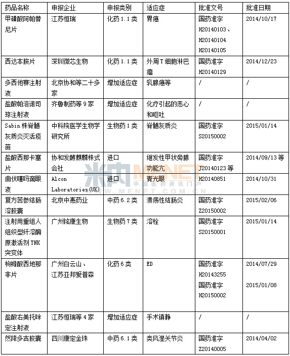 2014年為了提高患者獲得最新治療的可能性及可及性,藥審中心批準多個重要治療領(lǐng)域的藥品上市,這為企業(yè)的管理者提供了一個思路。這次CDE批準了9個重點治療領(lǐng)域的12個品種,涉及到抗腫瘤、抗風(fēng)濕以及疫苗、麻醉鎮(zhèn)痛用藥和內(nèi)分泌系統(tǒng)、眼科、消化系統(tǒng)、心血管系統(tǒng)、生殖系統(tǒng)等疾病的方方面面。其中最多的是治療腫瘤領(lǐng)域,江蘇恒瑞在2013年因甲磺酸伊馬替尼片劑和膠囊登上CDE重點領(lǐng)域獲批品種后,今年又因甲磺酸阿帕替尼片再次上榜,顯示出企業(yè)強大的研發(fā)實力。